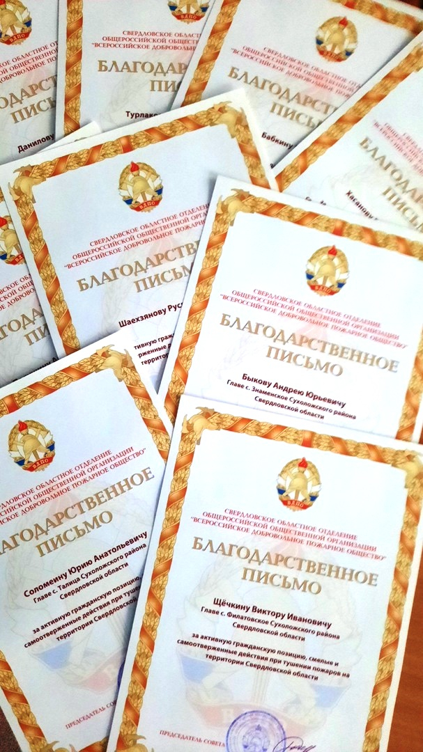 Так же, за плодотворную деятельность в области обеспечения пожарной безопасности, за активное участие в тушении пожаров благодарственными письмами председателя совета Свердловского областного отделения ВДПО Сергея Ринатовича Бакирова награждены добровольные пожарные и волонтёры участвовавшие в тушении лесного пожара деревни Малый Таушкан: